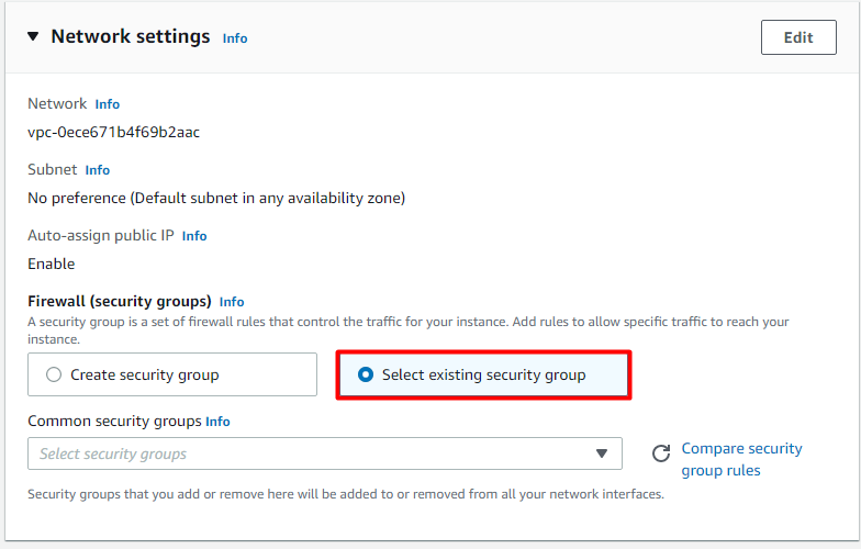 In the Network settings, choose the existing security group and the default one.