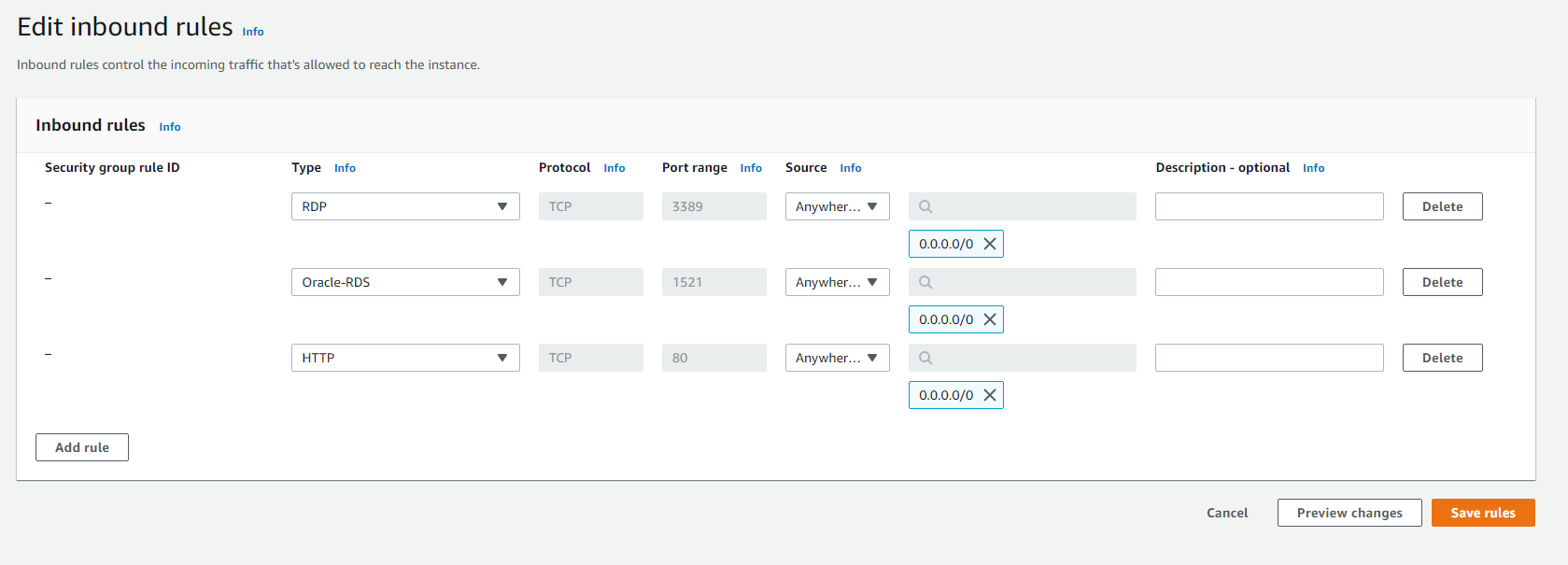 We will add RDP(Remote Desktop Protocol), Oracle-RDS, and HTTP(Hypertext Transfer Protocol) and save.