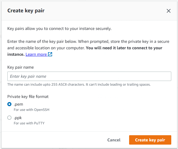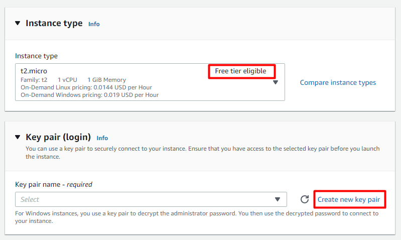 Also, check the Free tier eligiblity with the instance type. Click create new key pair.