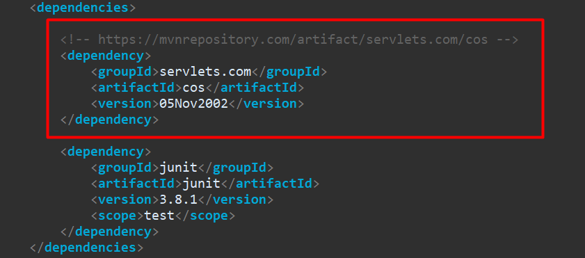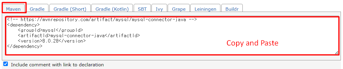 4. Copy the maven dependency tags and paste into the pom.xml file.