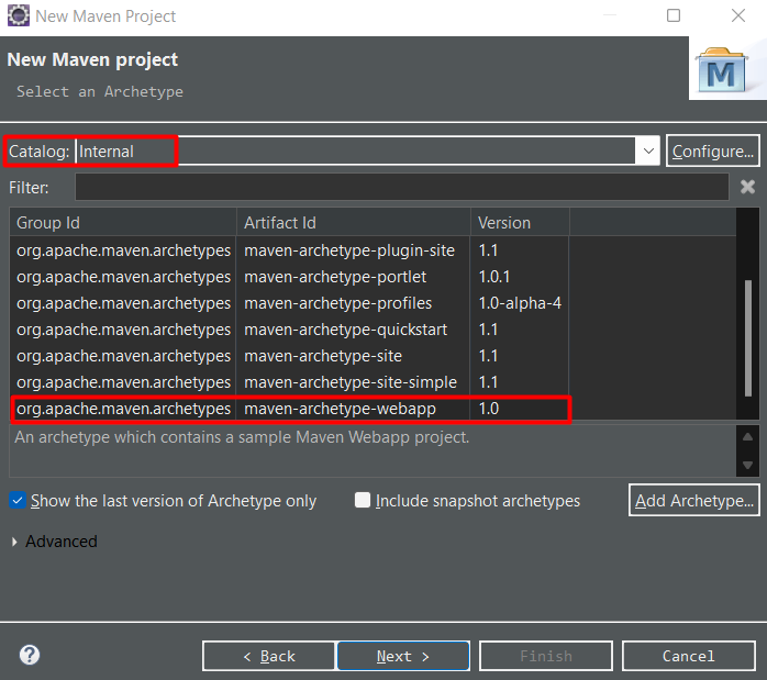 maven-archetype-webapp is for web development, so for our next project, we are choosing this. Depending on the artifact id, you will see the different structures.