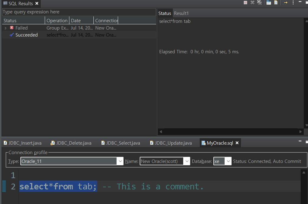 4.enter 'select * from tab;' block -> Alt + X to execute *To comment out : --