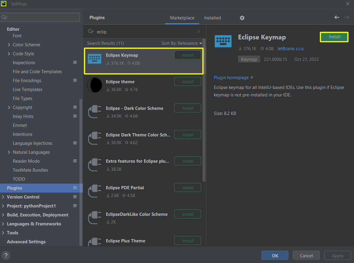 To install the keymap plugins that PyCharm doesn't have, click Get more keymaps in Settings / Plugins.